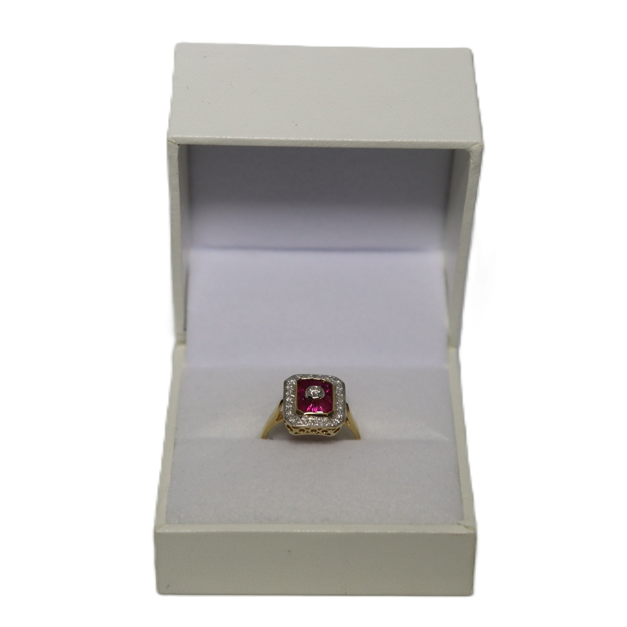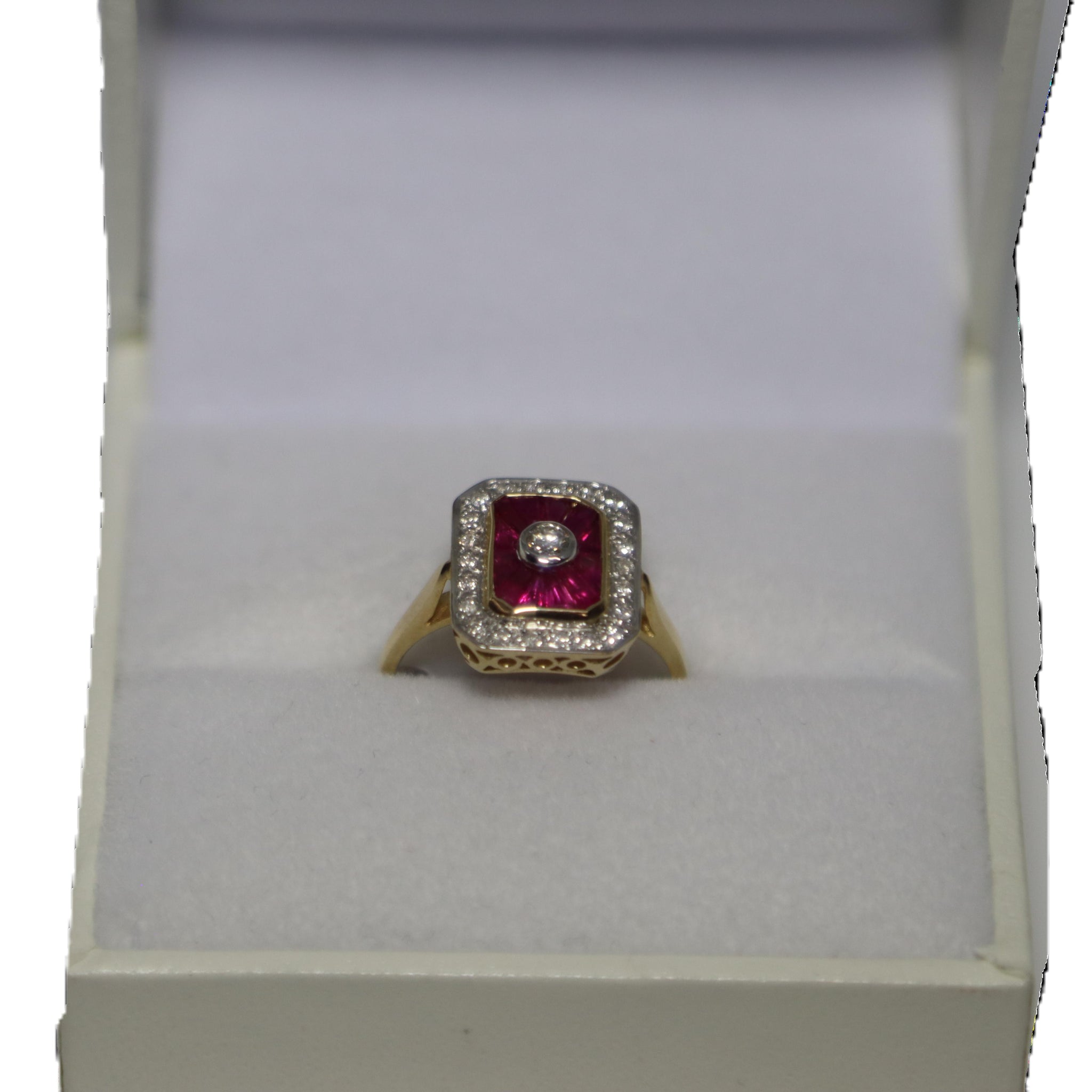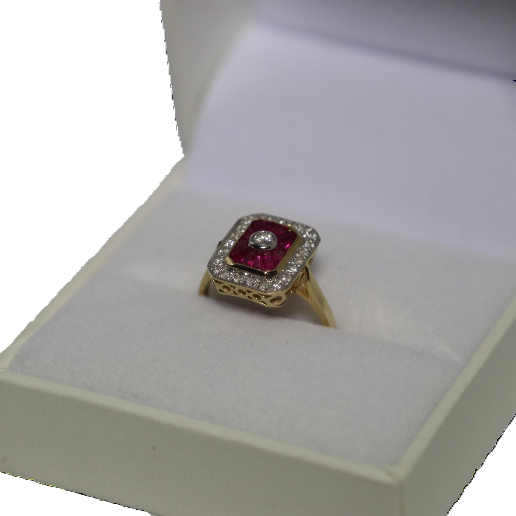 9ct Yellow Gold Central Diamond Channel Set Tapered Rubies in Rectangle Set Pave Set Diamond Border Art Deco Cluster Ring